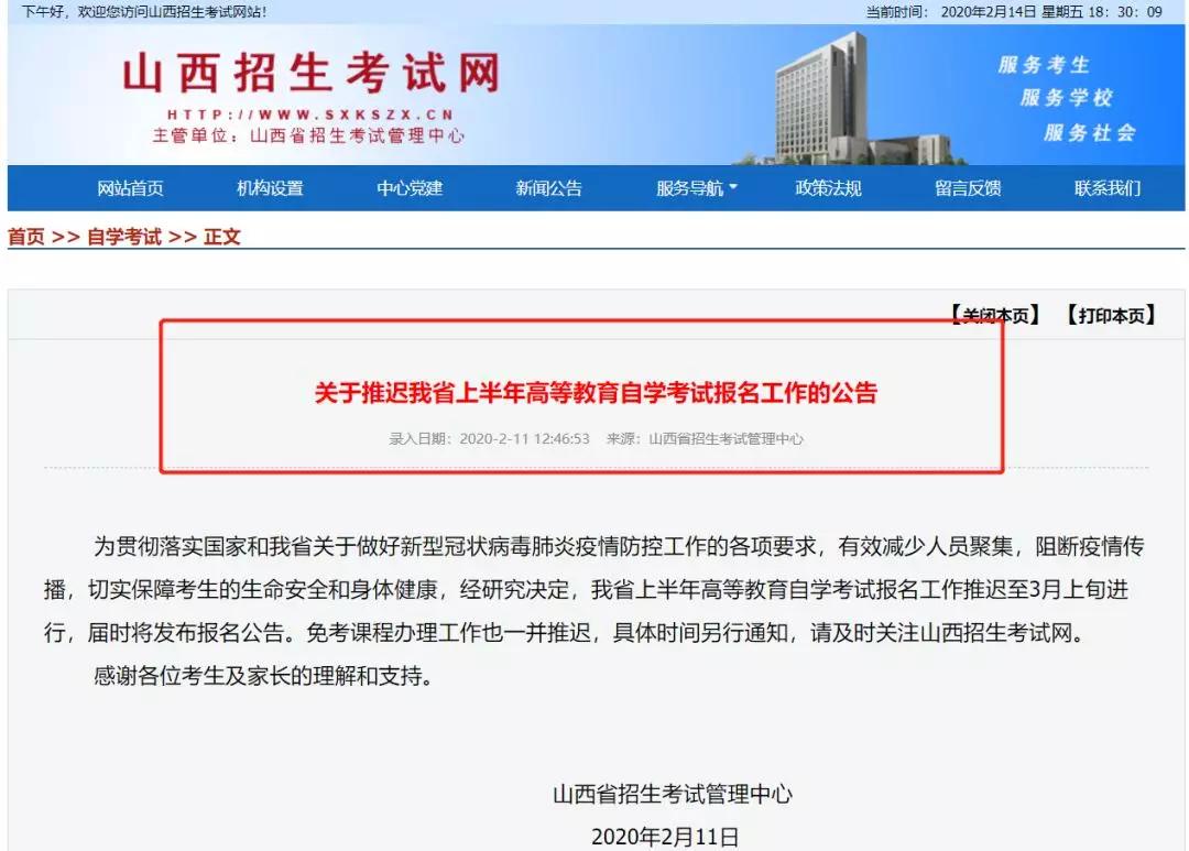 为了贯彻落实国家和深圳关于预防新病毒性肺炎疫情的要求,有效降低人员集中度,阻断疫情蔓延,有效保护考生生命安全和身体健康,经研究决定,今年上半年深圳高等教育注册自学考试延期至3月初,届时将发布注册公告。