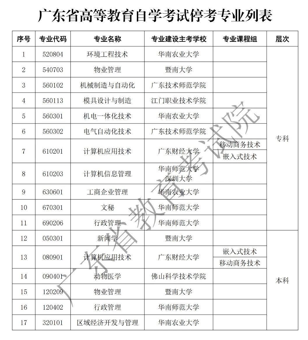 每年自考都会有一些政策调整,比如停学和专业停学。2019年9月,深圳教育考试学院公布17个专业停考。